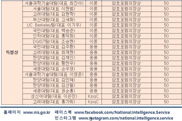 ▲ 국정원, 2025 국가암호공모전 수상팀 명단 [출처=국가정보원]