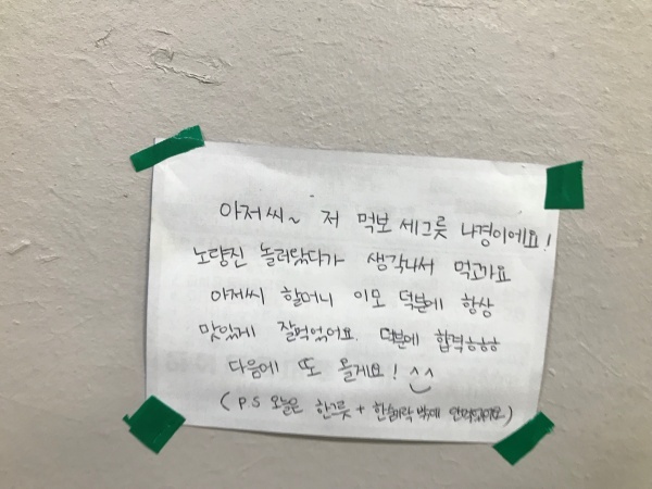 50년 동안 노량진에서 밥 장사를 했다는 주인 할머니의 자세한 설명도 덤으로 들었다. 메모에 적힌 이모티콘을 보면서 경북 어느 지역에서 공무원을 하고 있다는 20대의 발랄함을 느낄 수 있었다.