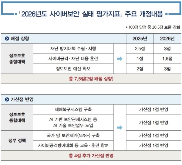 특히 2025년 발생한 정부 온나라시스템 해킹·국가정보자원관리원 화재로 인한 대민 서비스 마비와 같은 사고가 재발하지 않도록 해당 항목 평가를 강화해 국가·공공기관의 보안관리 수준을 제고할 예정이다.