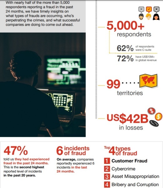 5000명 이상의 응답자 중 약 47%가 지난 24개월 동안 사기를 경험했다. 지난 20년 동안 PwC의 조사 기간 중 2번째로 높은 수준인 것으로 나타났다.