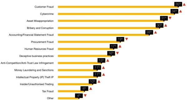 사이버 범죄를 경험한 사람은 34%, 자산횡령은 31%, 뇌물 및 부패는 30%, 회계/제무제표 사기는 28%, 조달 사기는 19%, 채용 사기는 17%, 사기성 비지니스 관행은 16% 순이다.