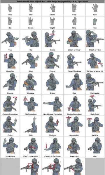 작전 진행 중에 타겟이나 제3자에게 인지되지 않도록 작전 변경을 위한 수신호도 사용한다. 수신호를 보낼 경우 과도한 동작을 하면 제3자가 눈치채므로 주의한다.