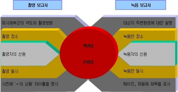 위와 같은 몇 가지 내용이 보고서에 포함돼야 한다. 그리고 사진을 찍던 음성을 녹취하던 간에 디지털 기기와 아날로그 기기에 대한 증거능력은 차이가 있으므로 주의를 기울인다.