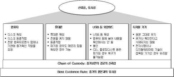 위와 같이 모든 증거물에 대한 증거보전 절차를 철저하게 지켰을 경우에만 증거물의 신뢰성을 확보할 수 있다. 증거물은 원본과 동일하다는 유사성도 확보돼야 한다.