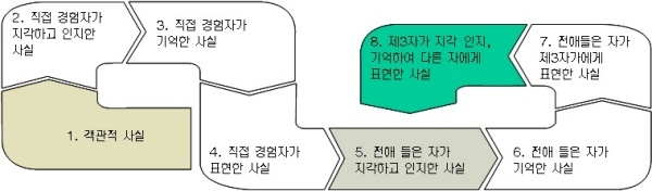 다음 2단계는 현장에 있었던 경험자가 지각하고 인지한 사실이다. 동일한 현상과 이야기를 듣게 되더라도 사람의 경험과 지식수준, 감정의 상태에 따라 지각하는 것이 달라진다.