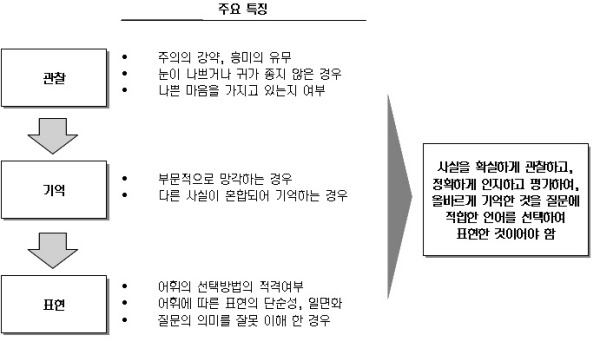 증인이 자신이 경험한 내용을 진술하는 구조는 특정상황이나 증거물을 보는 관찰에서 출발해 이 같은 내용을 기억했다가 필요할 경우에 표현하는 단계를 거치게 된다.