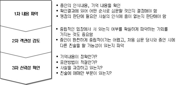 셋째, 3단계에서는 증인의 증언능력과 성격 등을 파악해 유죄의 증거로 활용할 수 있는지 판단한다. 증인이 기억하고 있는 내용이 정확한가? 증인이 경험한 내용을 적절한 표현방법으로 구술하고 있는가? 증인이 증언하는 내용에 과장은 없는가? 증인의 진술에 논리적으로 맞지 않는 애매한 부문은 없는가? 등을 파악해 정리한다.