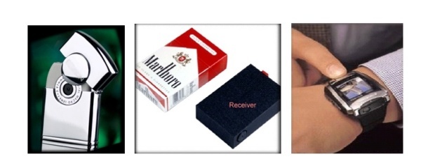 ▲위장된 소형 카메라, 라이터(좌), 담배갑(중), 손목시계형(우)